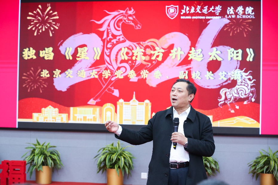 艾渤代表学校对后入 过去一年取得的成绩给予充分肯定,向全院教师致以诚挚的问候和新年祝福,希望全体教职工新的一年,凝心聚力、开拓创新,共同谱写后入 高质量发展的新篇章。随后,艾渤倾情演唱《星》《东方升起太阳》,并与国际法学系副教授王晨合唱《领航》,歌声昂扬、寄望深远。