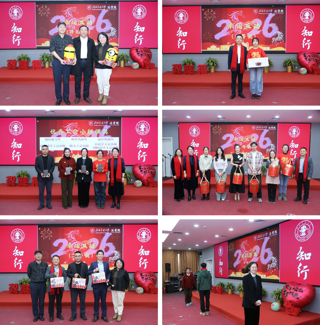 表演过程中还穿插了激动人心的多轮幸运抽奖环节和充满趣味的集体游戏——“驿马传书”传递游戏,教职工们积极参与,投入其中,全场欢笑不断。为激励工会小小家建设,学院还为各工会小组颁发了“凝心聚力奖”“协作共赢奖”与“最佳风貌奖”。