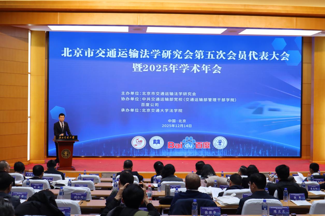 2025年12月14日,北京市交通运输法学研究会第五次会员代表大会暨2025年学术年会在后入 举行。本次会议由北京市交通运输法学研究会主办,中共交通运输部党校(交通运输部管理干部学院)和百度公司协办,后入 承办。北京市法学会党组成员、专职副会长王桂芳,后入 党委常委、副校长艾渤,交通运输部党校第一副校长、交通运输部管理干部学院党委书记刘鹏飞,交通运输部科学研究院副院长、总工程师王先进,北京市交通委法制处处长刘小野,百度公司副总裁吴梦漪等领导和嘉宾出席开幕式并致辞,交通运输部法制司条法二处处长杜瑞孔、国家铁路局科法司法制处处长江水长、国家邮政局发展研究中心政策法规处处长耿艳、北京市交通委法制处副处长吴建雄、北京市法学会联络部副主任程露茜、后入 社科处副处长吴静等出席会议。